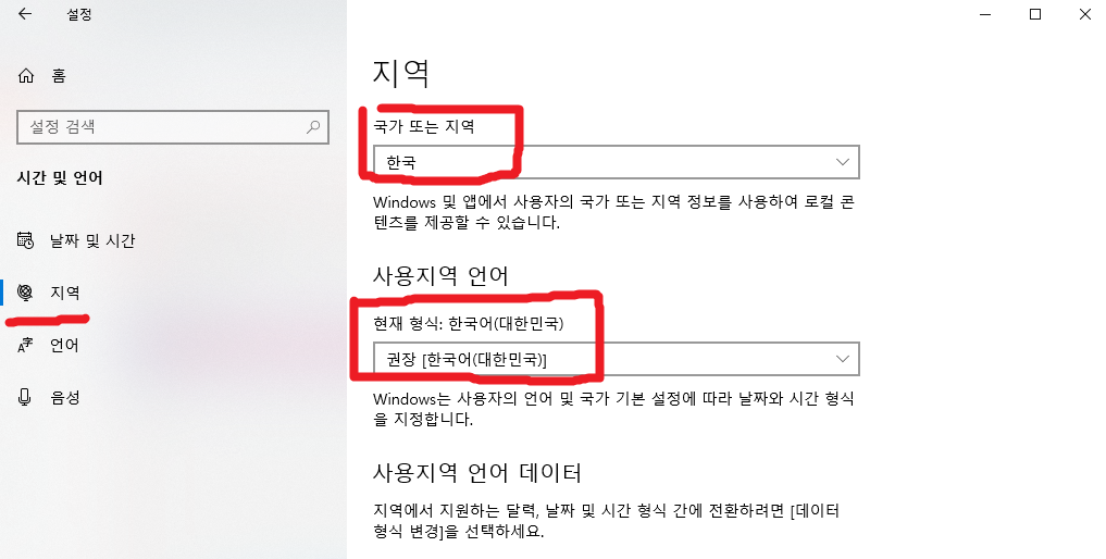 그 후 "지역" Tab 에서 아래 그림과 같이 한국어로 설정 해줍니다.