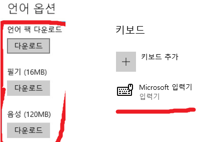 설치한 언어를 선택 후 옵션 버튼을 누르면 언어 팩 다운로드 의 "다운로드"를 눌러서 다운로드 하시면 됩니다.