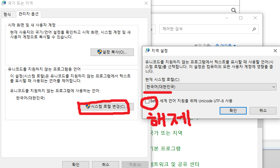 4. 관리자 옵션 > 시스템 로캘 변경(C)..... > 현재 시스템 로캘(C) 한국어(대한민국) 설정, Beta~~ 체크박스 해제!!!!