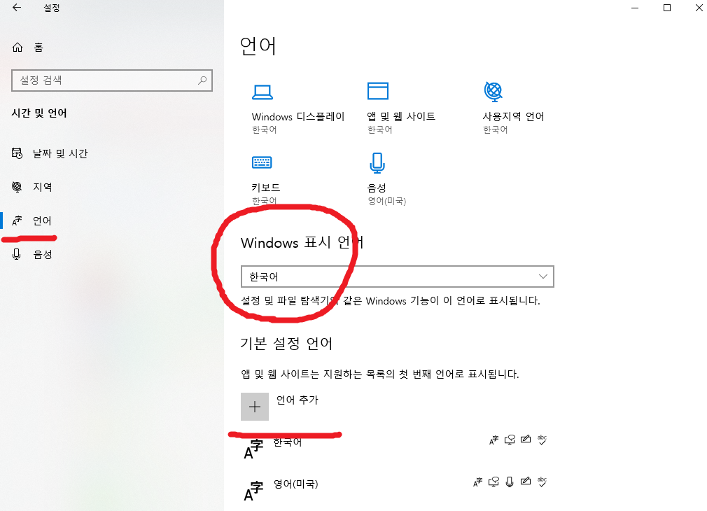 만약 한국어가 없다면, " + 언어 추가 " 를 통해서 한국어를 설치하셔야 합니다.(다른 필요한 언어를 선택 후에 설치 하시면 됩니다. 설치 후 선택!)