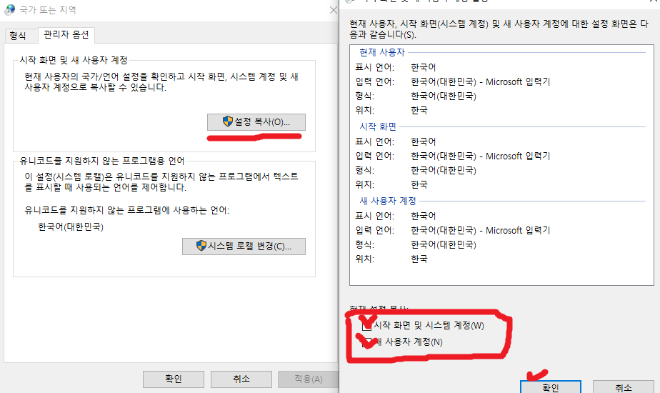 3. 관리자 옵션 > 설정 복사(O).... > 두개 체크박스 선택(계속 한국어로 할꺼라면!)