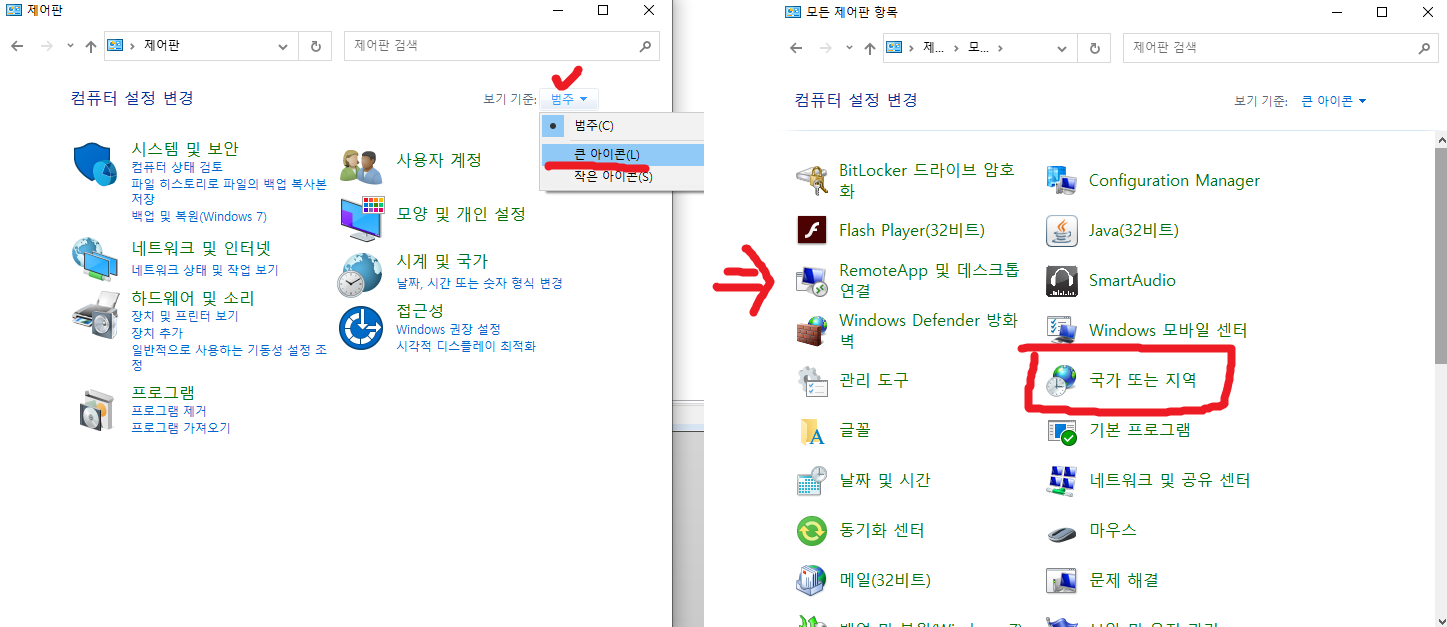 그럼 아래와 같이 제어판에서 설정할 수 있는 항목이 나오고 큰 아이콘으로 보기로 범주를 선택하면 "국가 또는 지역" 이 나오는데요 들어가시면 됩니다.