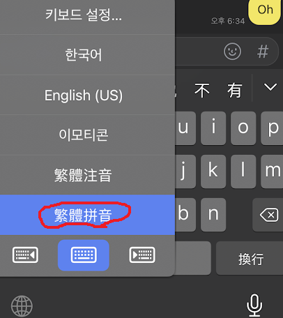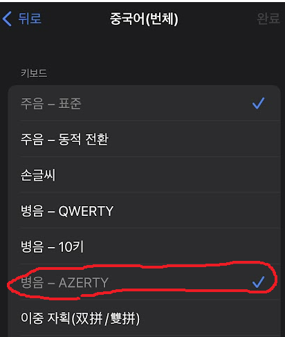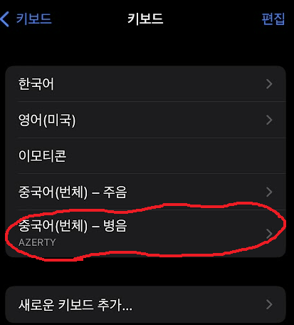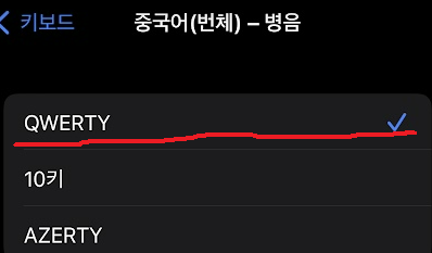 아이폰 > 설정 > 일반 > 키보드 > 키보드 > 새로운 키보드 추가 > 중국어(번체) > 병음 - AZERTY 를 설치하시면 됩니다.