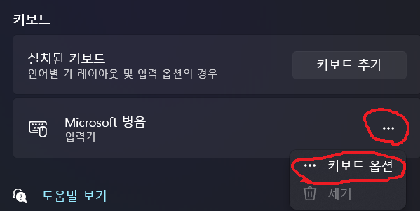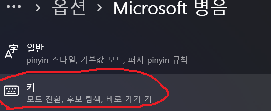 키보드의 Microsoft 병음의 더보기를 눌러 키보드 옵션을 선택 합니다.