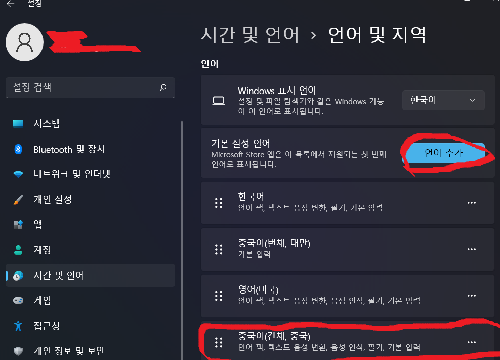 1. 시작 > 설정 > 시간 및 언어 > 입력 > 관련설정 > 언어 및 지역 > 언어추가 버튼 클릭 > 중국어(간체, 중국) 설치!!