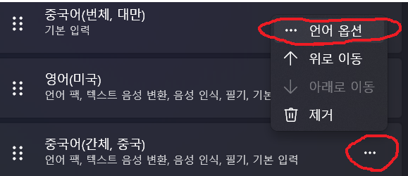 중국어(간체, 중국)의 더보기 버튼으로 언어옵션 쪽으로 들어간 후