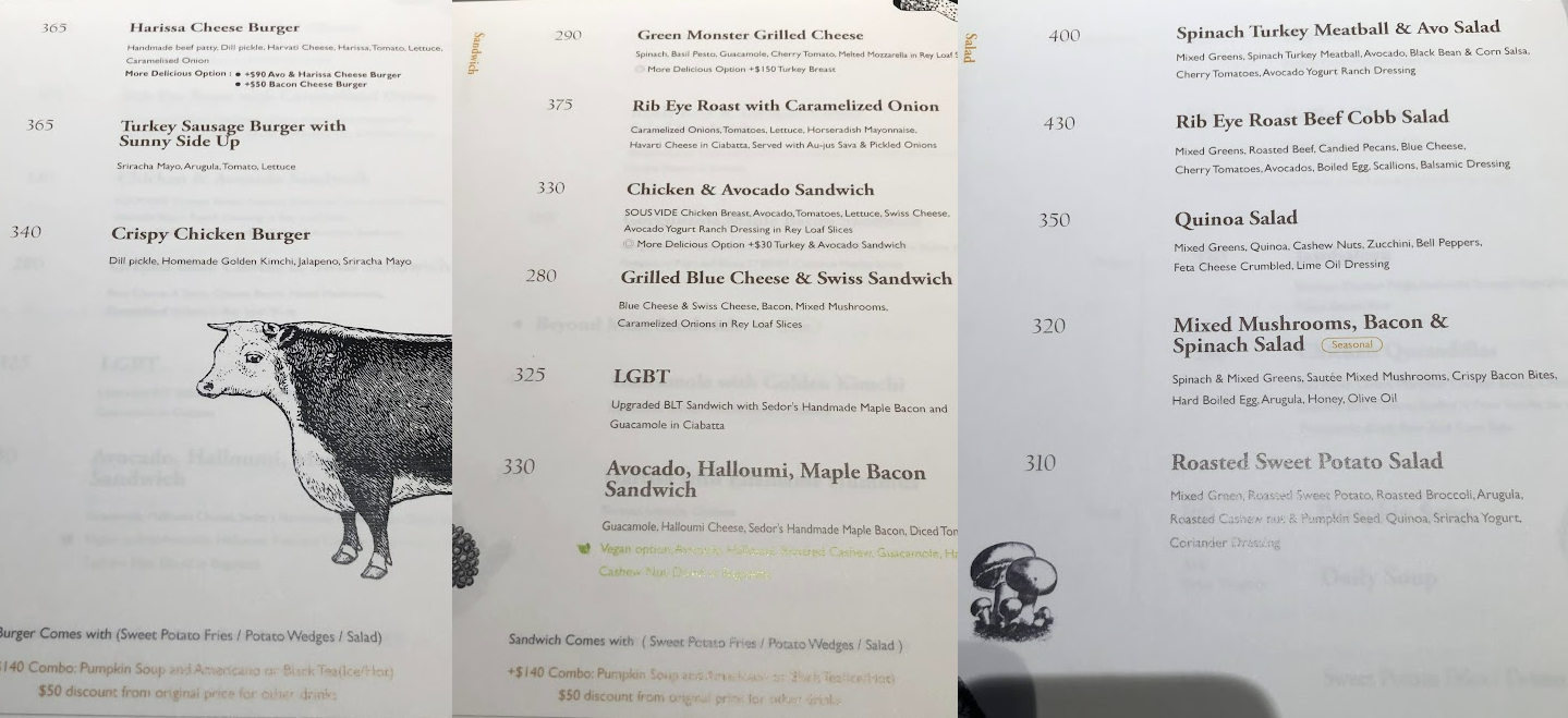 메뉴판을 좀 찍어봤는데 건강해 보이는 샐러드들이 많네요! 아이를 위한 음식도 있구요!