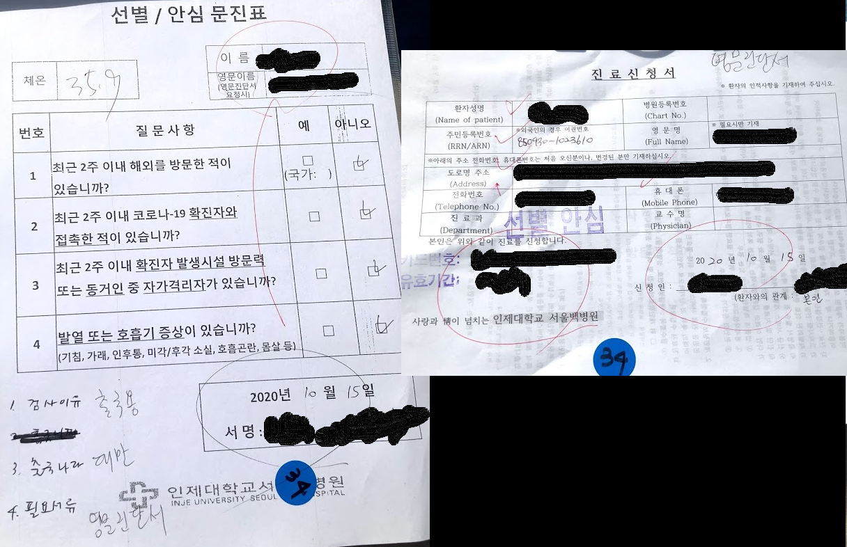 ㅎㅎㅎ 코로나 검사 받으러 왔다고 하니, 종이 2장을 주시면서 여행할 곳, 검사 사유를 물어보시더라구요~