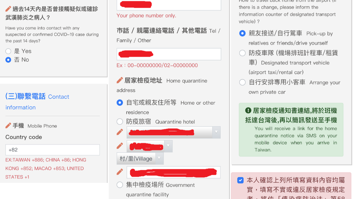 Home or other residence 체크 (전 대만에서 격리할 집이 있어서 체크했어요, 호텔에서 있으실 분은 Quarantine hotel 을 체크하셔야 해요)