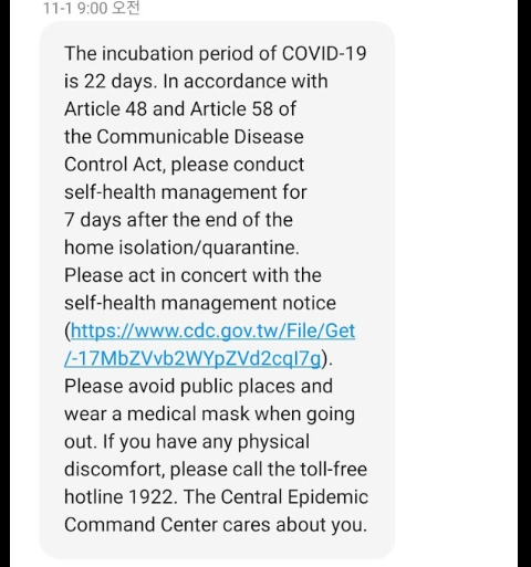 전 격리기간이 끝나면 문자/전화 더이상 안오는 줄 알았는데. 코로나 잠복기는 22일 이라면서 문자가 꾸준히 오더라구요.