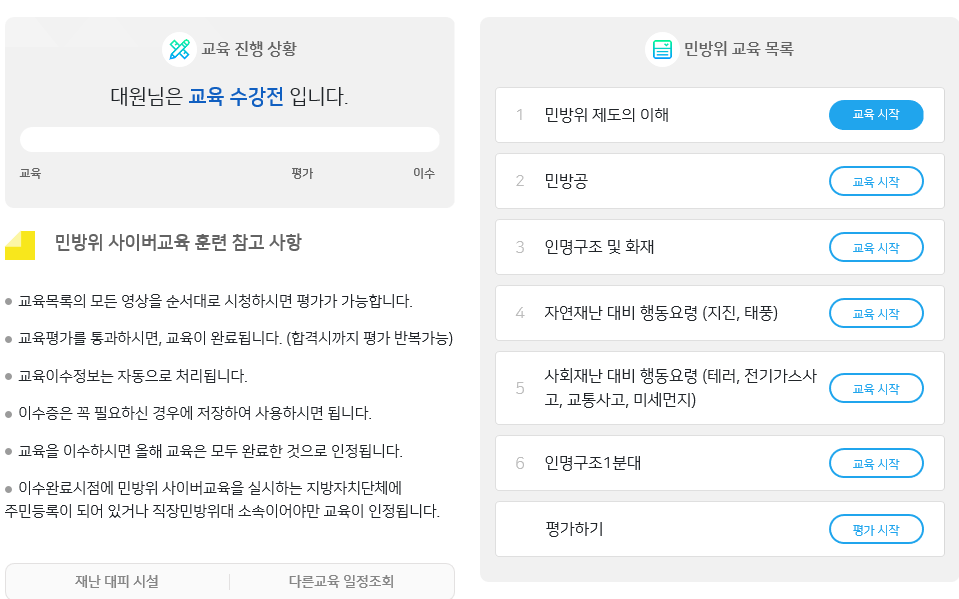 네이버 또는 다음에서 민방위 사이버교육을 검색해서 들어가면 된다~ 링크도 걸어둘께요